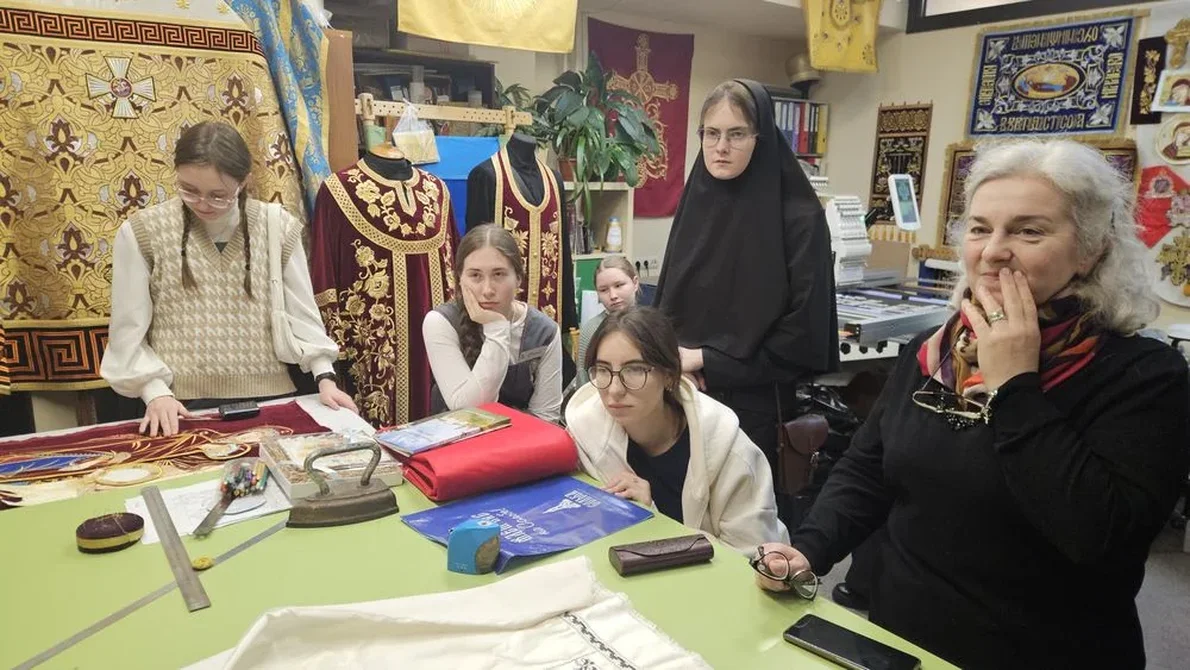 В эту же поездку студентки посетили ещё одно интересное место – мастерскую церковной вышивки Дениса Цуканова. Здесь рождаются удивительной и неповторимой красоты плащаницы Спасителя и Богородицы, хоругви, покровцы́ и возду́хи, священнические облачения и другие изделия, необходимые для богослужений и убранства храма.