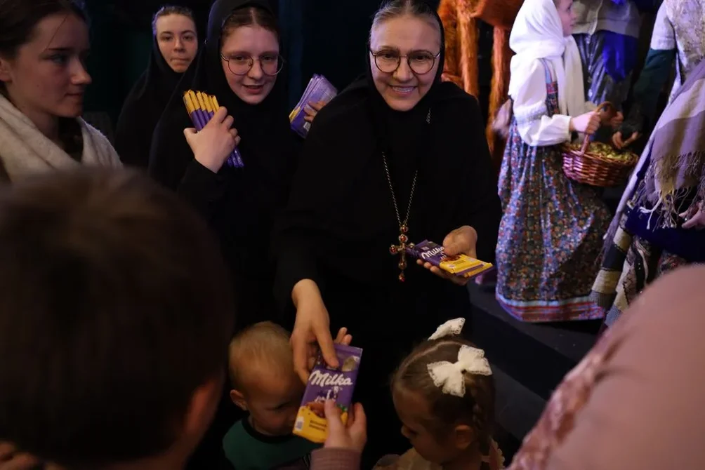 Восторженные зрители не жалели ладошек и долго не отпускали артистов со сцены. Матушка игумения Еротиида вручила школьникам заслуженные сладкие подарки и ещё раз поздравила всех со Светлой Пасхой.
