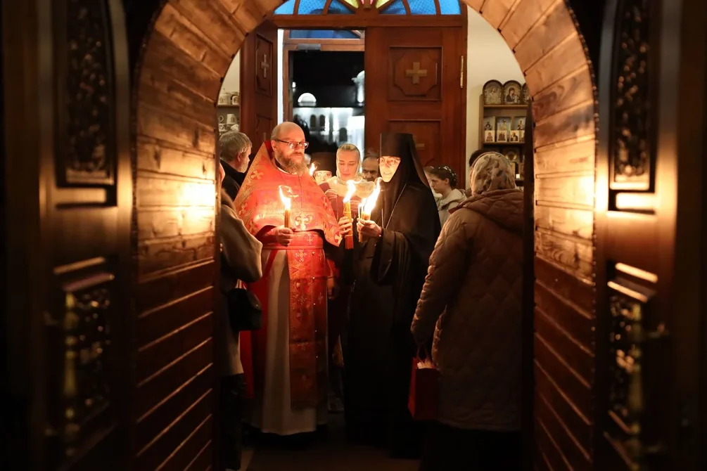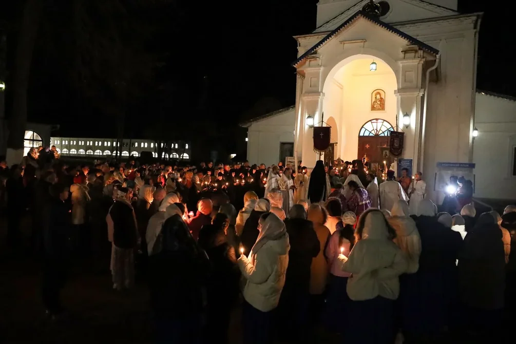 Ночное богослужение началось великопостной полу́нощницей, после которой все вышли на крестный ход. Так два тысячелетия назад шли ко Гробу Спасителя в предутренней мгле жены-мироносицы. Перед входом в гробовую пещеру они узнали о чуде Воскресения. В наше время Ангела, отвалившего камень от входа в пещеру, символизирует священник, который возглавляет службу. Когда вся толпа подходит к закрытым дверям храма в трепетном молчании, он начинает праздничную Пасхальную заутреню долгожданными словами: «Христос Воскресе!»